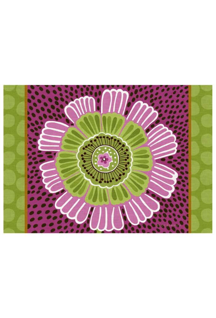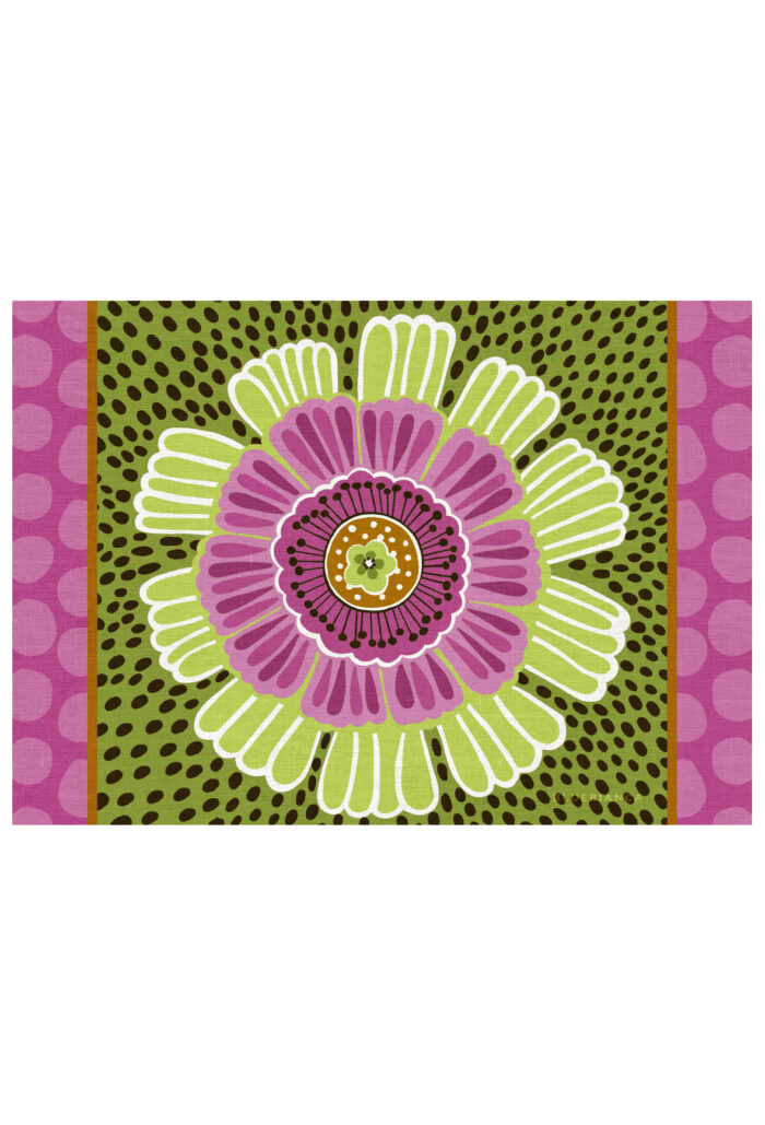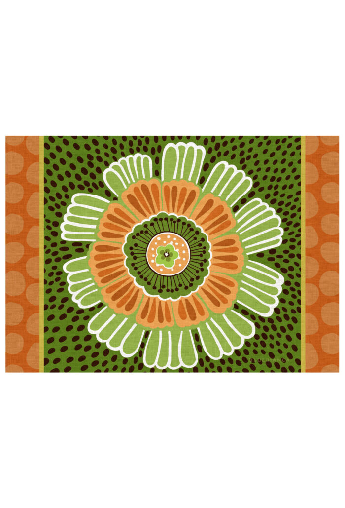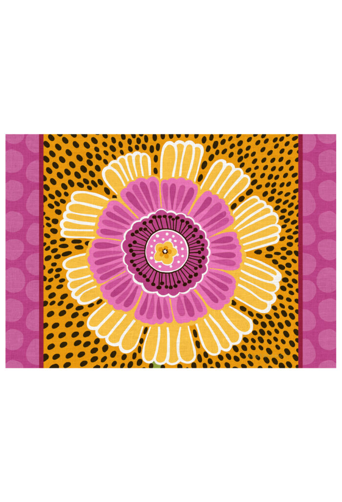 Il motivo, inscritto nel cerchio, crea un equilibrio perfetto tra decorazione e ordine. È una composizione pensata per essere protagonista sulla tavola, ma anche per dialogare con righe e tinte unite della palette 2026.