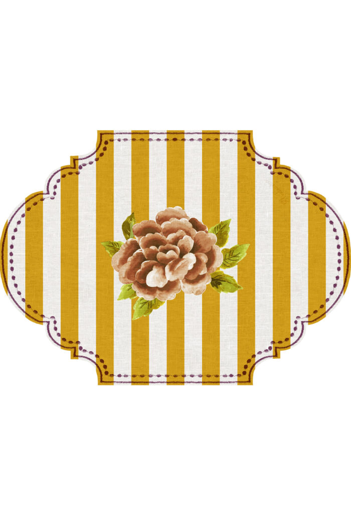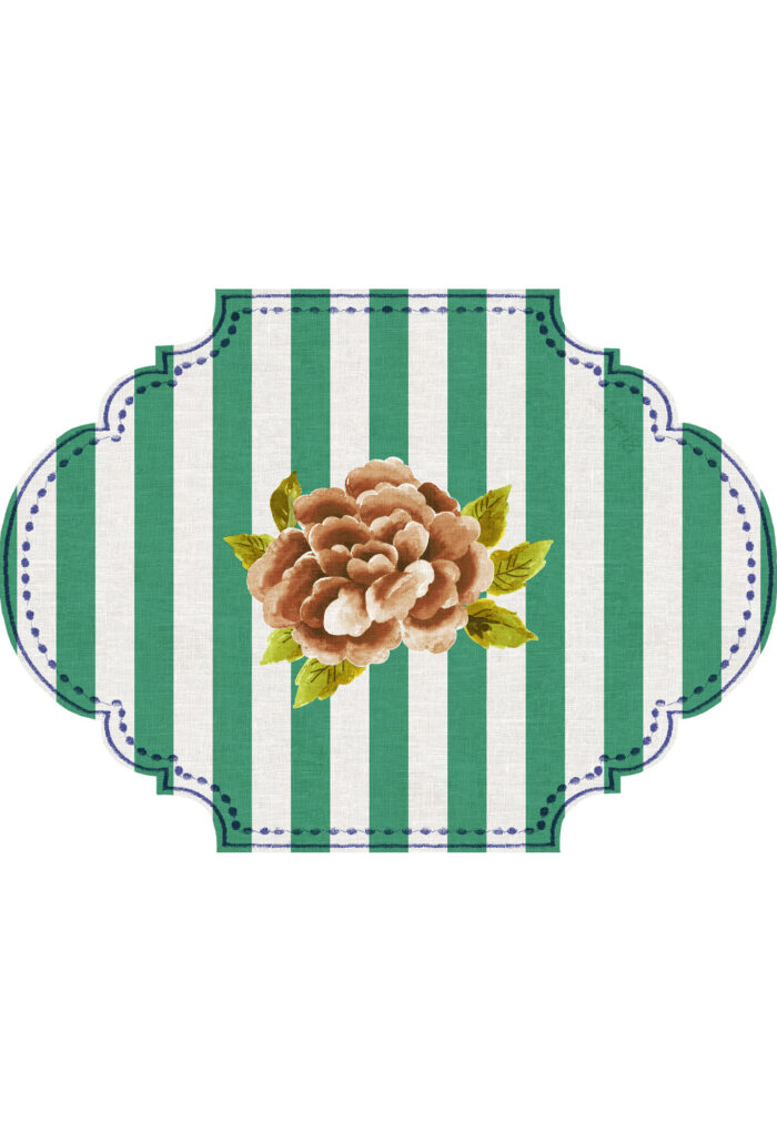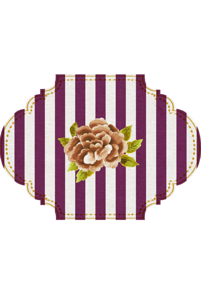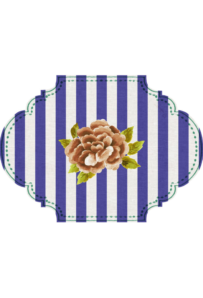 Le righe verticali, racchiuse da una cornice dal design ricercato con effetto finto ricamo, incorniciano il simbolo Bluebianca: la peonia centrale, delicata e iconica.